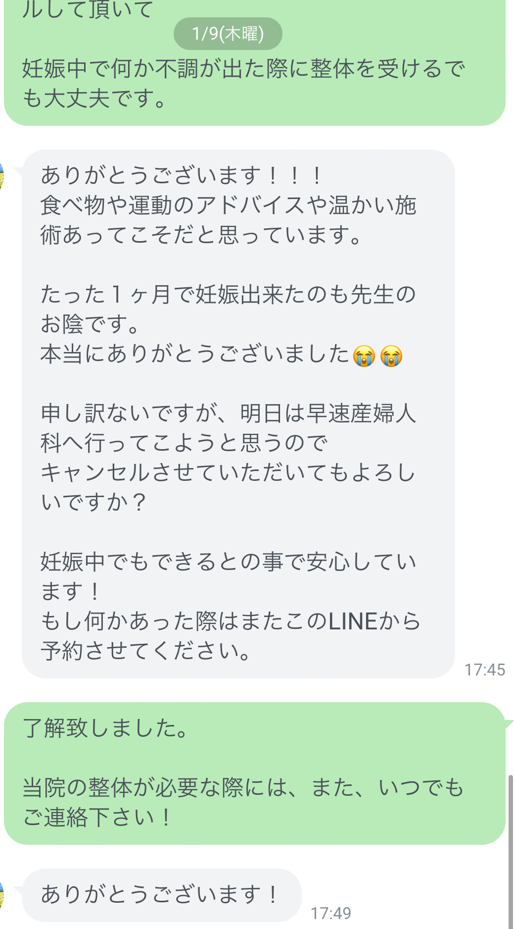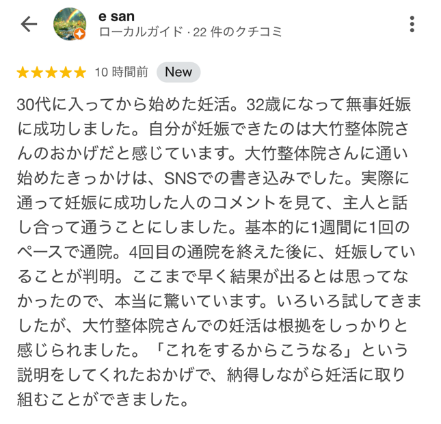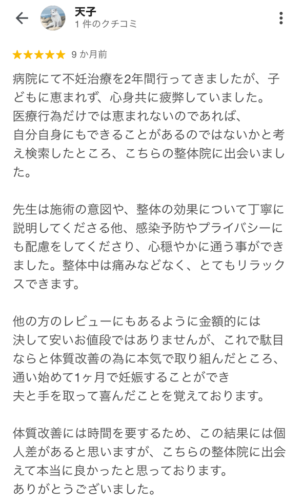 体の不調を整えて妊娠しやすい体づくりをする事はとても大切な事だと実感しました。私は整体に通ってよかったと思っています。