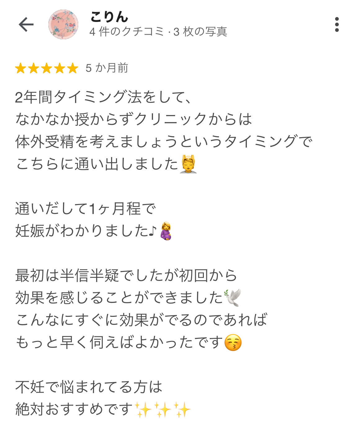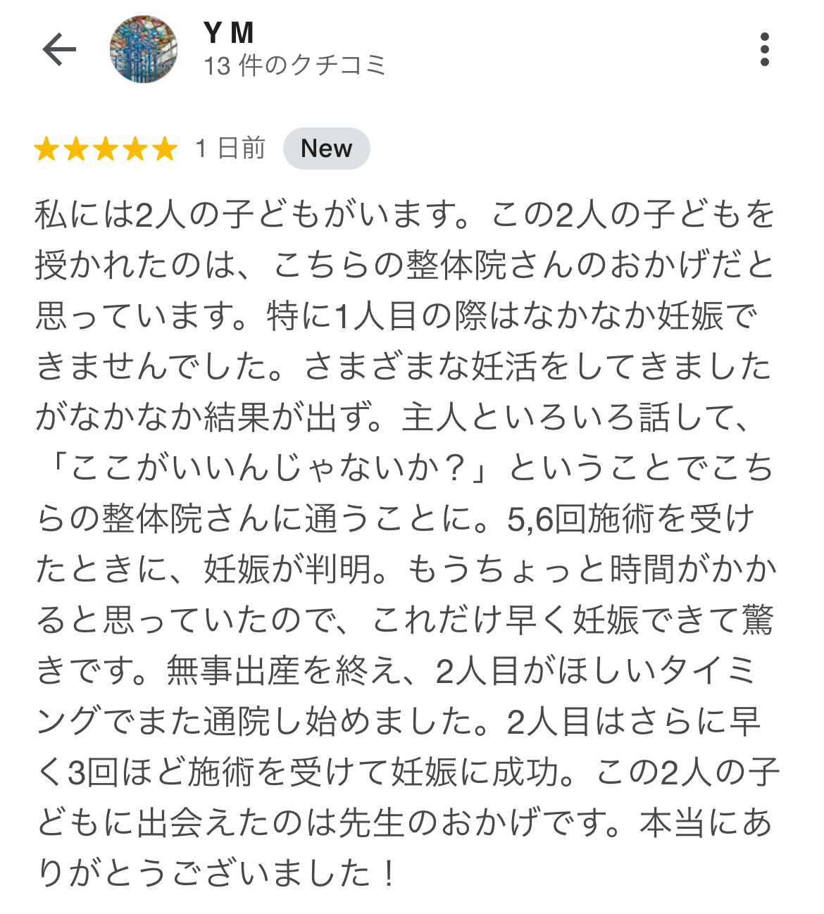 半年間、タイミング法で授からなかったのに、整体に週2回通いはじめて、5、6回で2人目を授かる事が出来ました。